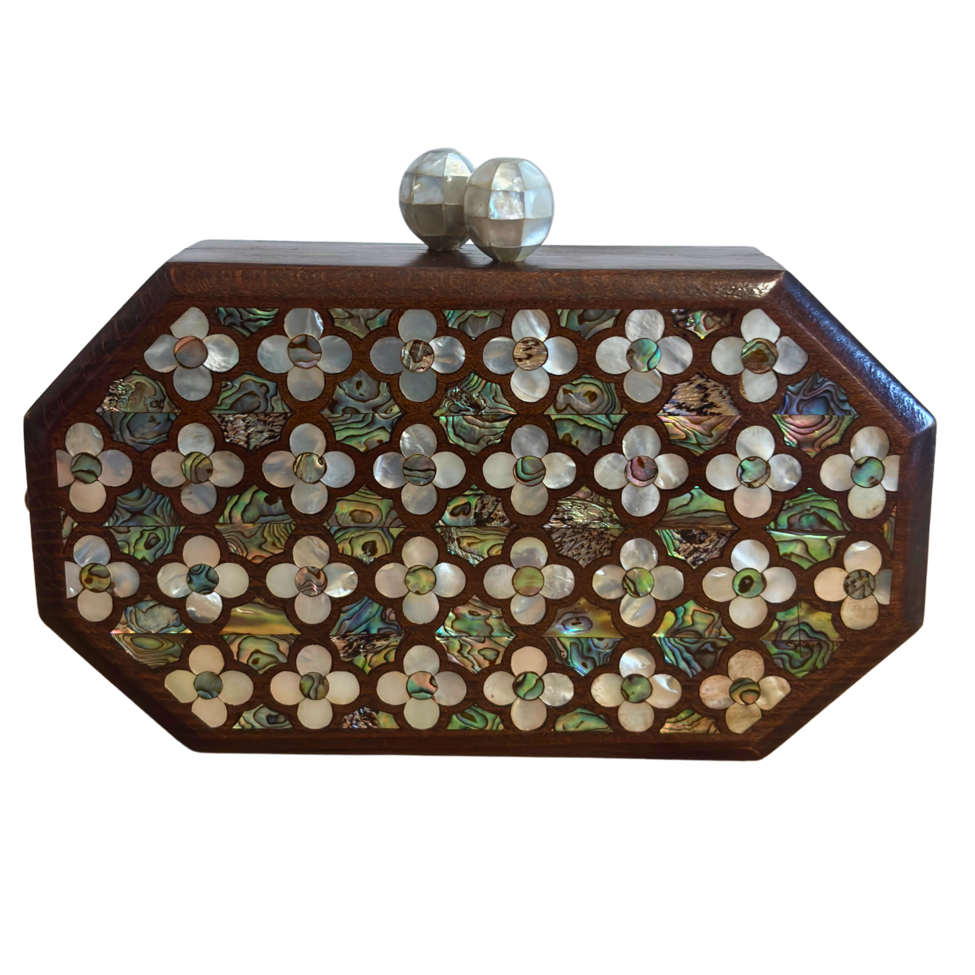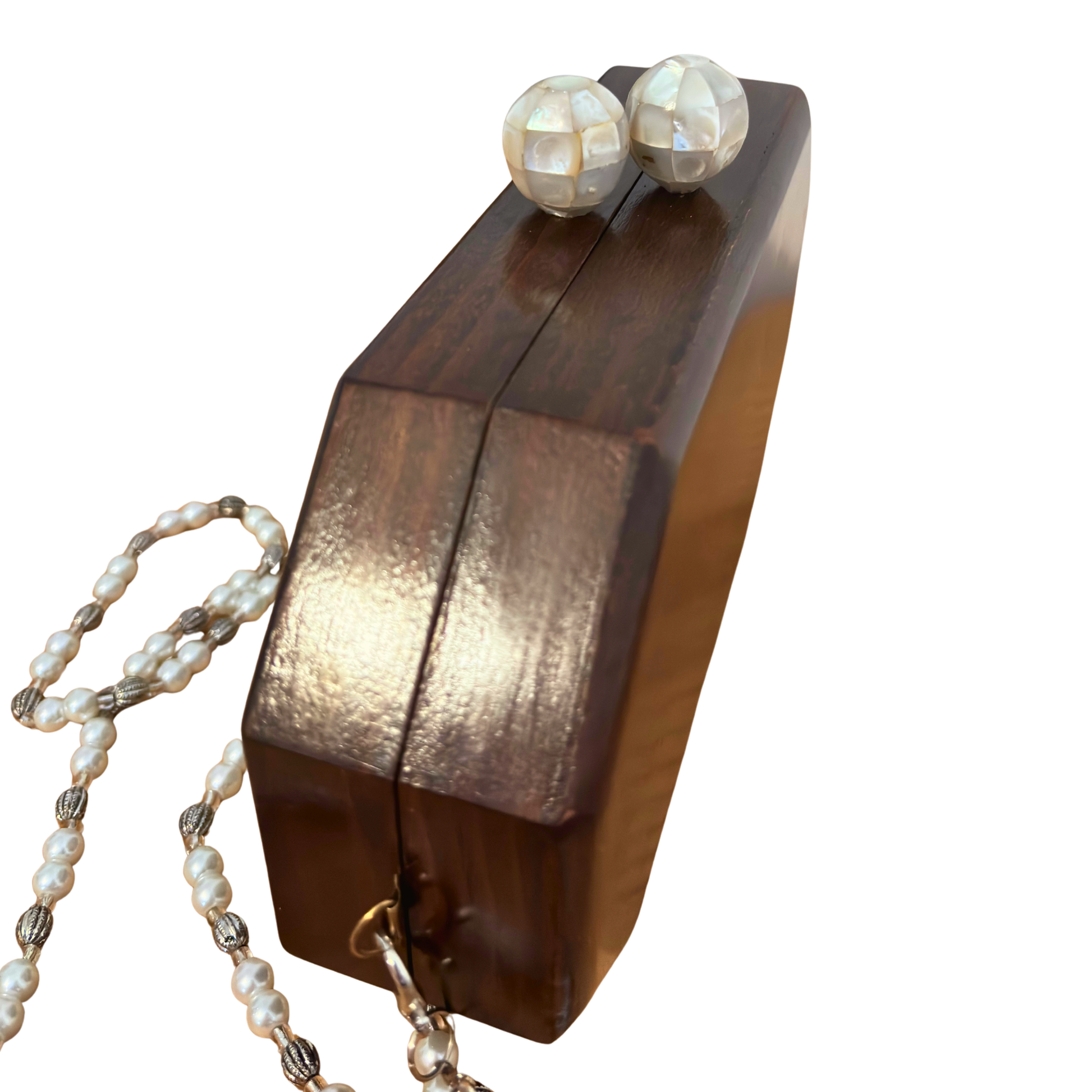 El Susurro de las Rosas – Bolso de Mano Damasquino de Nogal con Rosas de Nácar y Cadena de Perlas