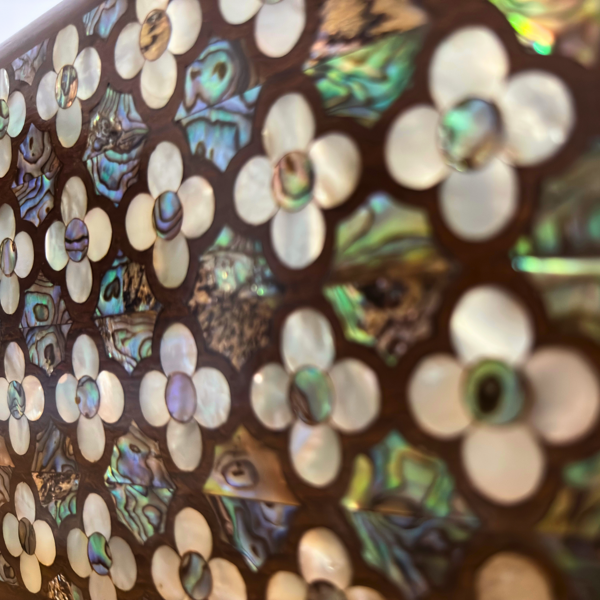 Tallado a mano en madera de nogal y decorado con rosas de nácar auténtico, brilla con cada destello de luz.